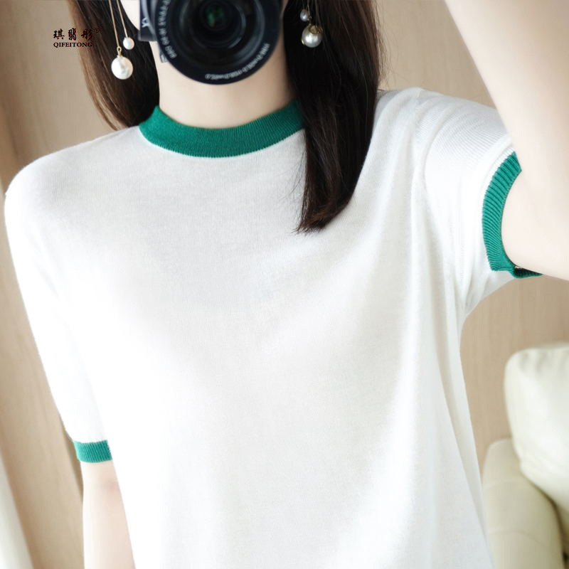 - 小众设计2022夏季女装新款宽松圆领拼色短款短袖韩版上衣针织T恤