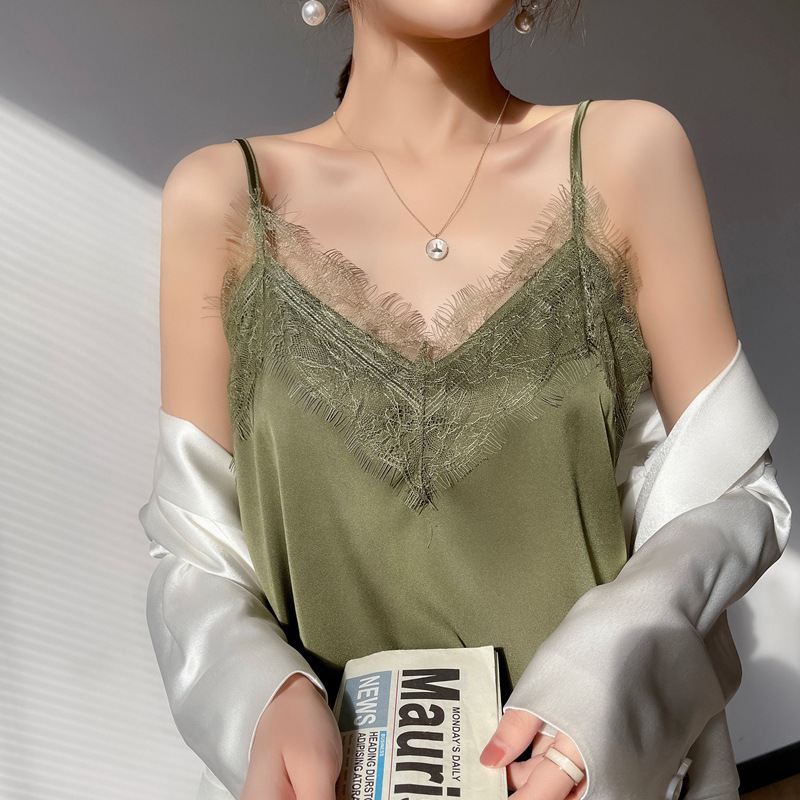 - 丝绸真丝2022春夏季女装新修身v领蕾丝短款内搭上衣单肩吊带背心