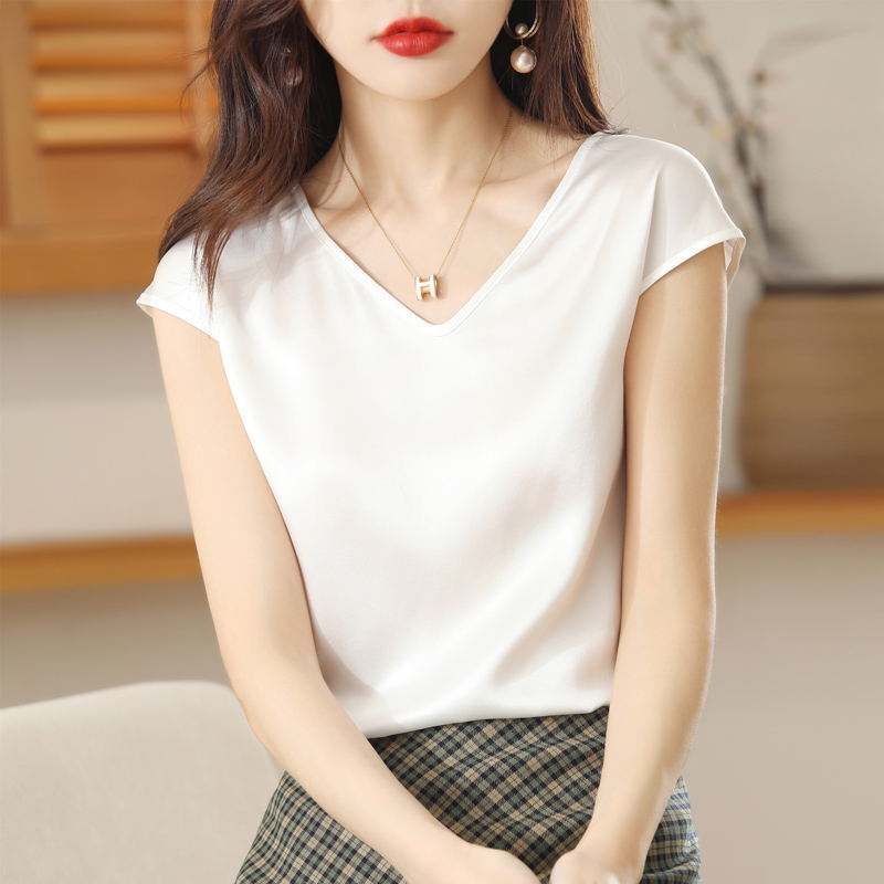 - 丝绸缎面真丝2022春夏季女装新款v领桑蚕丝短款宽松上衣短袖t恤