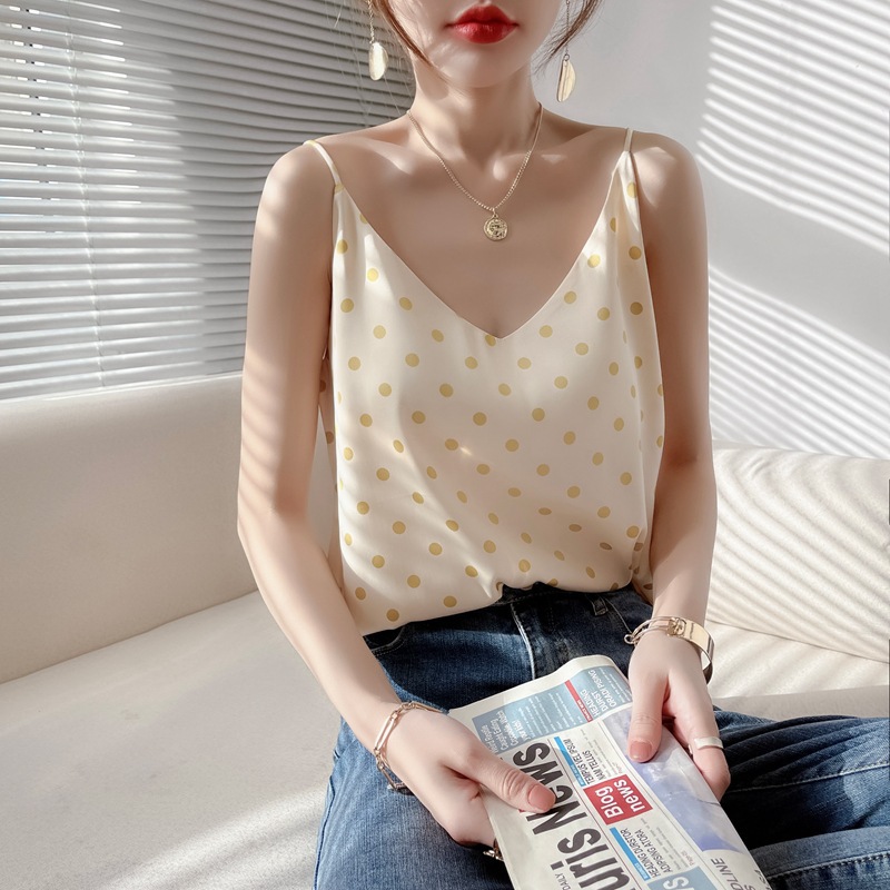 - 丝绸吊带2022春夏季女新款v领波点短款套头单肩细带外穿打底背心