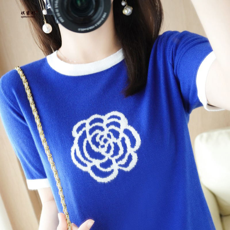 - 小众设计2022夏季女短款圆领拼色刺绣套头小香风短袖气质针织T恤