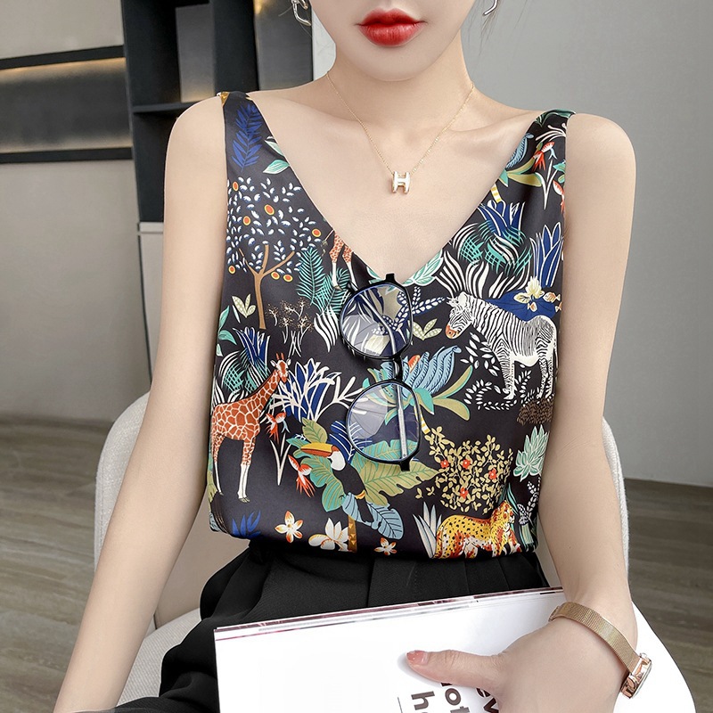 - 缎面真丝2022春夏季女装新修身v领短款小鹿内搭上衣双肩吊带背心