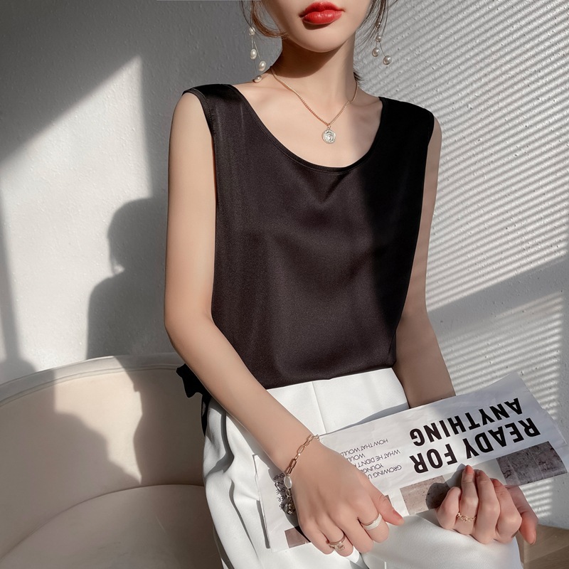 - 丝绸真丝2022夏季女新修身U领短款小众设计内搭上衣宽肩吊带背心