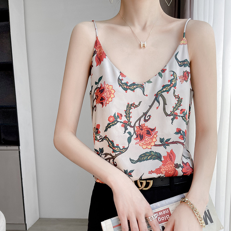 - 丝绸真丝2022春夏季女装新修身v领短款红花内搭上衣单肩吊带背心