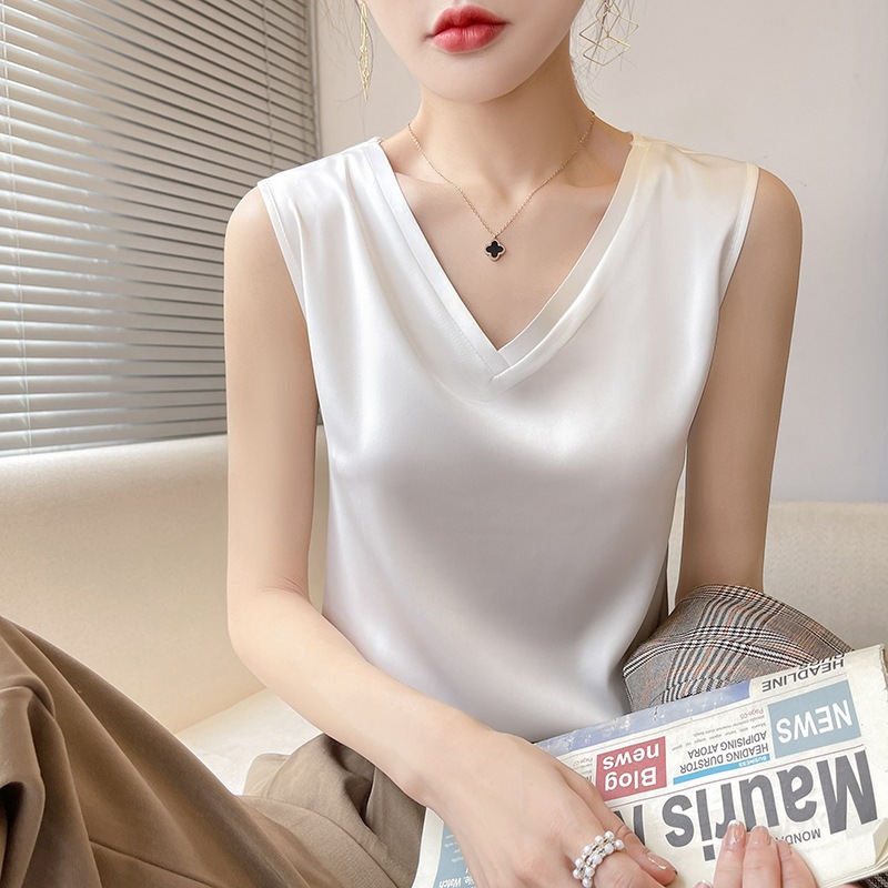 - 丝绸真丝2022春夏季女装新修身v领宽肩短款内搭无袖上衣吊带背心