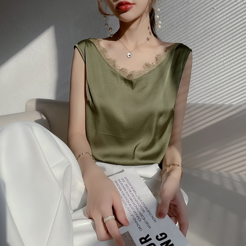 - 丝绸真丝2022春夏季女装新修身蕾丝v领短款气质内搭上衣吊带背心