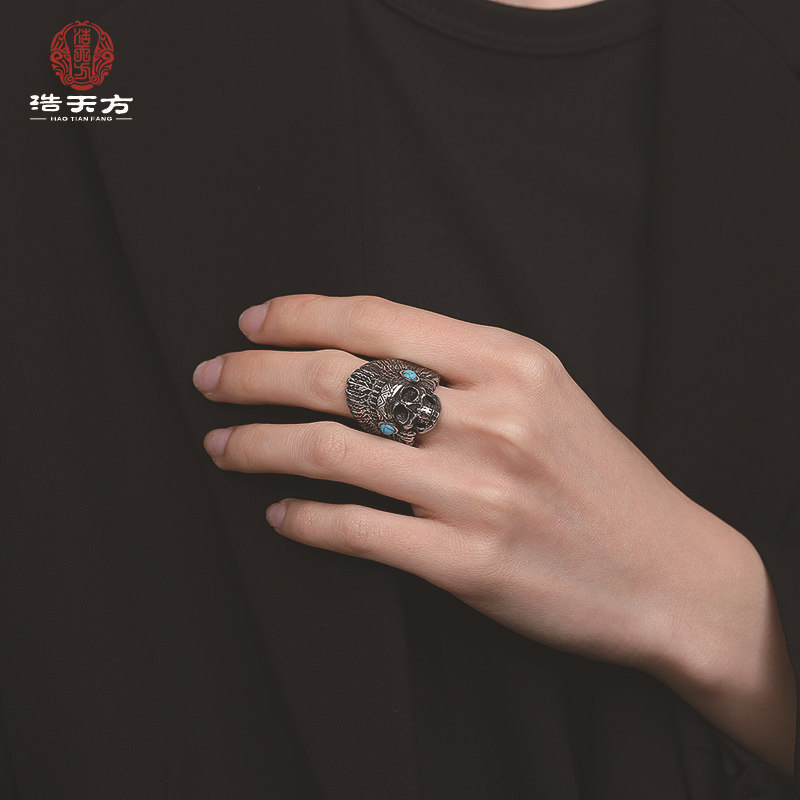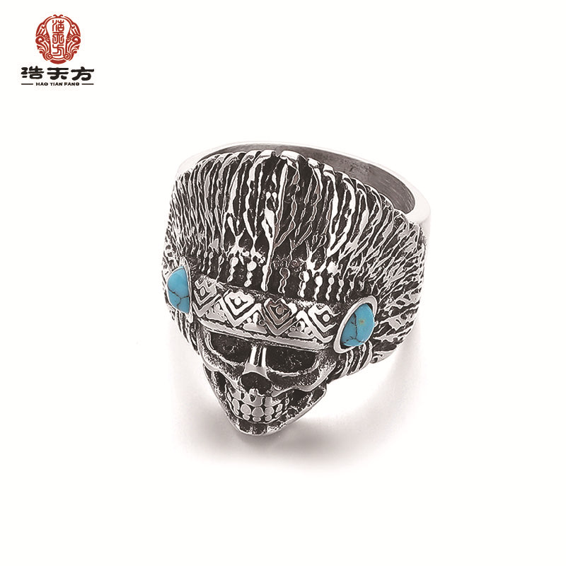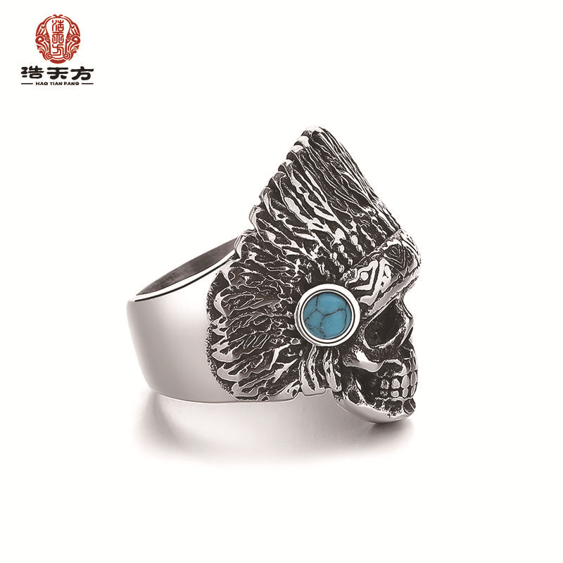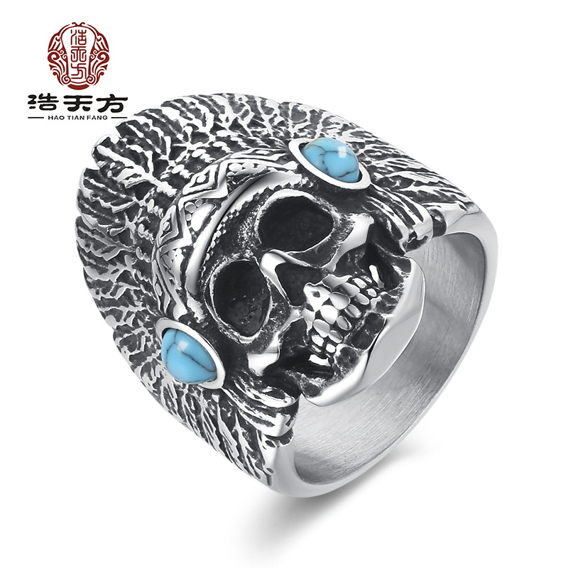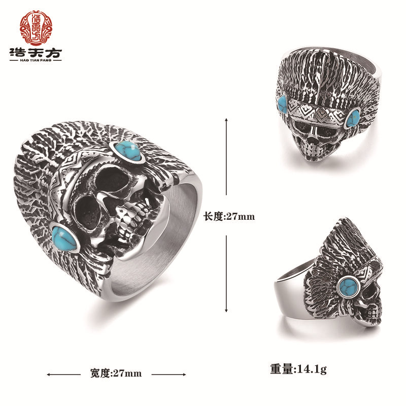钢铁战士个性钛钢松石戒指 复古男士指环印第安酋长大骷髅头手饰