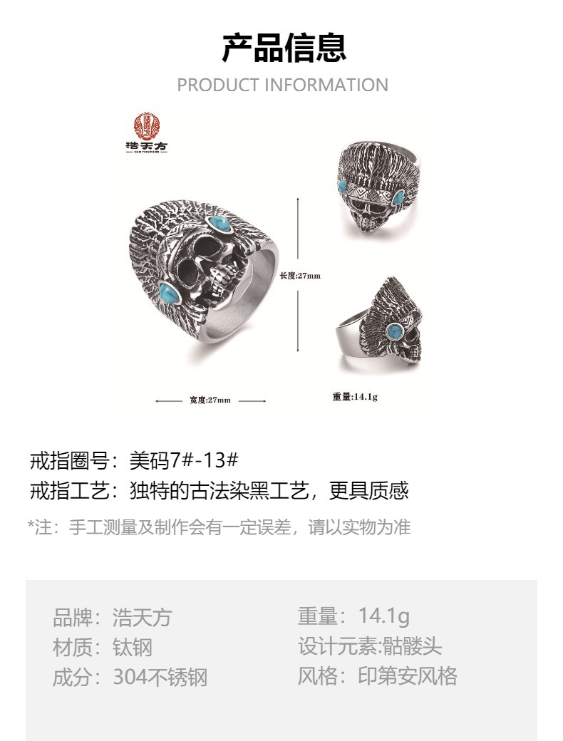 - Product name: Iron warrior stylish titanium steel turquoise ring retromen ring indian chief skull bracelet